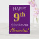 Cette carte de voeux d'anniversaire de mariage simple et personnalisée comporte le message "Joyeux 9e ANNIVERSAIRE", avec le "9e" ayant une apparence dorée imitation. La couverture comporte également un nom personnalisé et un fond violet. L'intérieur comporte un message de voeux d'anniversaire de mariage personnalisé. Cela pourrait être offert à un mari ou une femme pour célébrer le neuvième anniversaire de mariage du couple. [~Z0000089]
