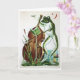 L'image sur cette carte montre une grenouille vintage jouant d'un violoncelle. A l'intérieur, il est écrit "Si la musique est la nourriture de l'amour, jouez !" par William Shakespeare.