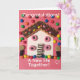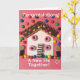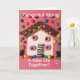 Maison douce conçue avec des friandises. Félicitations ! Une nouvelle carte de vie ensemble. Le message à l'intérieur est « Amusez-vous beaucoup ».