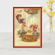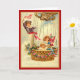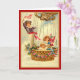 Carte d'anniversaire avec enfants à bord d'une montgolfière, dont un garçon portant une ceinture rouge agitant un drapeau américain. La corbeille de la montgolfière est ornée de fleurs rouges et de rubans bleus.
