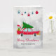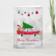 Carte de voeux avec une vieille voiture rouge cool portant un pin vert de Noël sur son toit et un cadeau caché dans le coffre ouvert. Des boules de Noël, des flocons de neige et des étoiles se sont accrochés au sommet. Situé sur un arrière - plan de livres d'argent avec des étoiles élégantes éparpillées un peu partout. A une belle ambiance rétro des années cinquante.