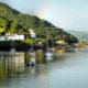 Après une journée de pluie, le soleil sort enfin et un arc-en-ciel apparaît dans le ciel, dans ce magnifique paysage du port d'Aberdyfi au Pays de Galles, avec des bateaux dans l'eau et quelques maisons du village.