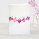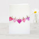 This greeting card shows five watercolor hearts hanging in a gentle curve across a white background. The hearts move from deep red and fuchsia on the left to lighter pinks, ending with a soft purple heart on the right. Each heart has slightly uneven edges and paint marks that make it feel hand-painted and personal. They’re clipped to a thin brown twine with tiny wooden clothespins, and you can see the light wood grain. There’s no printed message or lettering on the front, so the design stays simple and lets your own words do the talking. The bright, soft lighting keeps the scene airy and focused on love, friendship, and sweet moments ❤️💌. It feels like a small handmade note you’d pair with a kind message (and maybe a treat) 🍫.