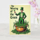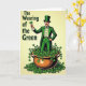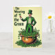 This design shows a well-dressed gentleman with a curled mustache standing tall inside a deep copper pot that’s overflowing with green shamrocks ☘️. He wears an emerald suit with a matching top hat, plus a shamrock-patterned shirt and bow tie that echo the greenery around him 💚. With an easy smile and a gentle tilt of his head, he offers one shamrock forward, like a friendly toast or a sweet invitation to step closer. The scene feels like a vintage poster, with strong outlines, saturated greens, and warm metallic tones that make the pot look glossy and heavy. Shamrocks spill over the rim, tumble down the sides, and spread across the ground, filling the space like a soft carpet of clover. Along the left side, the phrase “The Wearing of the Green” appears in dark green lettering, set apart from the central figure so your eye moves between the words and his outstretched hand. The layout stays balanced and centered, with the copper pot anchoring the bottom while the hat and shoulders rise above the clover burst. The background remains simple and light so the emerald suit, dark green text, and copper pot stand out clearly.