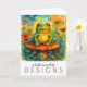 A charming green frog perches on a red mushroom surrounded by bright wildflowers in this whimsical watercolor design. Full of color and character, it's perfect for sending cheerful greetings to nature and animal lovers alike.