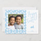 Celebrate Easter with this personalizable photo card designed by Destei. One side features a square spot for your photo that is framed with a thin white border and set against a light blue background patterned with white bunny silhouettes. The other side has a white background with “Happy Easter!” in playful tilted blue text, a lying-down blue bunny silhouette and space to add a name and year. The back of the card repeats the white bunny pattern over the blue background, creating a cohesive design perfect for spring greetings.