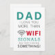 Montrez à papa à quel point il compte pour vous avec notre carte WiFi unique pour la fête des pères ! Avec son texte amusant et pertinent, "Papa, je t'aime plus que les signaux WiFi - et ça en dit long !" cette carte est parfaite pour les papas férus de technologie et ceux qui apprécient une bonne blague. Conçue avec une touche moderne et une mise en page élégante, c'est une façon sincère d'exprimer votre amour et votre appréciation. Rendez cette fête des pères inoubliable avec une carte qui en dit long sur votre lien et votre amour. Idéal pour tout papa qui apprécie à la fois l'humour et les sentiments sincères !
