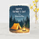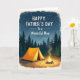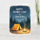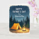 This design shows a calm wilderness night where a deep indigo sky is sprinkled with tiny white stars above a dark line of evergreen trees. Across the upper area, white uppercase text reads “HAPPY FATHER’S DAY - To a Wonderful Man,” standing out clearly against the night. Below, a cozy campsite scene suggests closeness, like friends or family settling in together after a long day, with everything arranged in an easy, welcoming way 👨. An orange-and-yellow tent sits on the sandy ground with a warm glow inside, hinting at someone waiting just out of view. Nearby, a small campfire burns in golden-orange tones, its light spreading outward as if inviting a quiet chat and a shared 🍺. Thin wisps of smoke lift into the cool air, softening the edges of the scene and adding a gentle, painted look. The firelight flickers across the sand while the forest remains a dark silhouette beneath the starry sky.