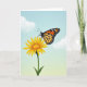 This card shows a large orange-and-black butterfly hovering close to a sunny yellow flower, as if leaning in for a gentle hello ❤️. Its wide wings are divided into warm orange panels with dark veins, and a neat row of small white spots traces the darker outer edge. Curved antennae and a slight tilt of the body add a tender, almost friendly focus toward the bloom. The flower sits in the lower middle with golden petals spreading from a deeper yellow, textured center, held by a sturdy green stem. Behind them, the sky fades from rich blue at the top to a soft green near the horizon, giving the scene an open, airy calm. The design includes a short Mother’s Day message placed near the top in a simple, dark font that stands out clearly against the sky 🌼. A few soft white clouds drift in the upper-left area, lightly brushed against the blue.
