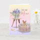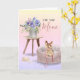 Cette carte d'anniversaire mignonne présente une illustration aquarelle adorable d'un Yorkshire Terrier assis dans son panier pour chien avec une laisse dans la gueule. La scène sur le devant de la carte comprend une gamelle, un os et une table en bois avec une boîte en fer-blanc de fleurs magnifiques sur un fond joyeux de couleurs pastel arc-en-ciel. L'intérieur de la carte comprend un gâteau et porte l'inscription "Joyeux Anniversaire ! (ma gamelle est vide)". Personnalisez-la avec votre propre message, le nom de votre précieux animal dans la gamelle (sur le devant et à l'intérieur de la carte) et la signature à l'intérieur au-dessus de l'empreinte de patte.