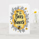 This greeting card features the phrase “You’re the Bees Knees” in flowing black lettering, centered inside a soft yellow, wavy shape with a deeper golden outline. Around the message, a loose wreath of grey-green leafy sprigs stretches outward, all drawn with simple black outlines. Small yellow flowers with six rounded petals are scattered through the leaves, ranging from tiny dots to slightly larger blooms. Beneath the words sits a cute bumblebee with black-and-yellow stripes and small white wings, as if it just landed there. The background is plain white, which makes the yellows and muted greens stand out without feeling busy. It feels like a sweet way to tell someone you admire them, with a little joke that still comes across as sincere 🥰. The message is easy to read and sits right in the middle, so your feelings come through clearly ❤️.
