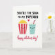 This greeting card features a white background with two smiling snack characters facing each other. On the left is a red-and-white striped popcorn bucket filled with golden popcorn, complete with rosy cheeks and a friendly expression. On the right is a teal soda cup decorated with white polka dots, topped with light foam and a red straw, smiling back just as sweetly. A small red heart floats between them, showing their connection. At the top, the message reads “YOU’RE THE SODA TO MY POPCORN” in simple black block lettering. Near the bottom, “happy valentine’s day!” appears in red cursive script, like a handwritten note. The open white space keeps the focus on the characters and their bond, making this a warm, lighthearted card for a partner or close friend on Valentine’s Day ❤️💌🍫.