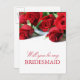 Carte de demoiselle d'honneur romantique en rouge et blanc avec des roses et des polices élégantes.
