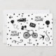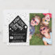 Adorable carte d'invitation mobile avec photo de famille à l'avant face à une petite maison excentrique et amusante avec les nouveaux détails d'adresse à l'intérieur et le "New Home Sweet Home" à la main sur le dessus. Sur le dos se trouve une jolie illustration motif en noir et blanc d'un vélo, d'une voiture, d'une clé, d'un ballon et du texte "Nous avons bougé !"