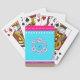 Jolies cartes à jouer qui ont un design mignon et coloré. Joli design de fleurs violettes au centre d'un arrière - plan bleu clair avec bande rose sur le dessus, rayures sur le fond avec une bande de pois. Ce jeu de cartes peut être personnalisé en ajoutant du texte.