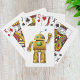 Les robots peuvent être amicaux comme le prouve cette conception. Ce design est un robot amical qui est debout et agitant. Le robot est doré et a un bouton vert sur la poitrine et les yeux verts. Ce design robot convivial semble très bien sur ces cartes à jouer. Parfait pour vous-même ou comme cadeau