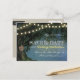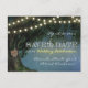 Cartes de mariage en chêne sculpté rustique pour annoncer la date - avec un fond étoilé et un grand-père chêne rustique qui a un cœur sculpté. Vous pouvez personnaliser les initiales sculptées à votre goût. Ce design comprend également des guirlandes lumineuses en haut et "Célébration de mariage" dans un texte similaire lumineux.