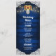 Cartes de menu de mariage en pot Mason tournesol en bois - présentent un fond en bois de grange bleu habillé de dentelle et décoré de guirlandes lumineuses chaudes. Le design présente également un bouquet de tournesols dans un pot Mason que vous pouvez personnaliser avec les initiales de votre choix. Le verso présente le même fond rustique de campagne que l'avant.