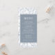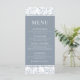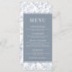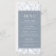 Elégante carte de menu mariage d'inspiration classique française d'un bleu poussiéreux à motifs floraux.