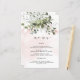 Le design présente des éclaboussures d'aquarelle rose pâle ou rousse avec des éclaboussures imprimées en or simulées. Le design présente également des éléments floraux rose vif dans un bouquet ou une couronne de verdure. La couronne contient un succulent eucalyptus et d'autres éléments de verdure dans les tons vert émeraude foncé, vert sauge, bleu poussiéreux et plus pour s'adapter à toutes les saisons que votre mariage peut tomber dans et les couleurs qui complètent la couleur rougir.