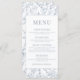 Elégante carte de menu mariage à motifs floraux bleu poussiéreux d'inspiration française moderne.