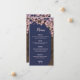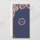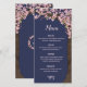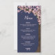 Carte de menu ou de programme entièrement personnalisable, avec une branche de fleurs de cerisier rose pâle sur un fond bleu nuit. Tout le texte est entièrement modifiable. Le verso présente une couronne de fleurs de cerisier dans laquelle vous pouvez ajouter les initiales du couple, une date ou le texte de votre choix.