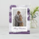 Cartes de Noël vintage violet personnalisées avec un titre de police de script élégant, et un cadre photo avec cadeaux de Noël et chute de neige. Personnalisez facilement ces cartes vintages de Noël photo avec votre photo, et le nom de famille. Créez une carte de Noël violet magique pour votre famille et vos amis en cette période de fêtes.
