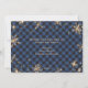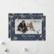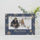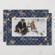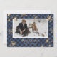 Belles cartes de Noël à double face de buffle bleu plaid avec des flocons de neige mousseux et des étoiles avec un titre de calligraphie et un cadre photo. Un texte personnalisé avec des flocons de neige étincelants et des étoiles sur un buffle bleu plaqué arrière - plan à l'arrière.