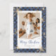 Cartes de Noël bleu brillant personnalisées avec des flocons de neige, des étoiles et des chutes de neige sur un arrière - plan de buffle bleu. Personnalisez facilement ces cartes bleues de Noël avec votre image, votre texte et un nom de famille.