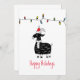 Illustration de chèvre noire avec chapeau de Père Noël rouge, chaîne de lumières de vacances et texte personnalisable "Joyeuses Fêtes"