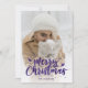 Cartes personnalisées de Noël violet avec une photo recouverte de neige et police en écriture manuscrite sur l'avant et faux papier mauve avec neige à l'arrière. Personnalisez facilement ces cartes de Noël violettes avec votre image et votre texte.