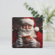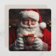 Cette carte de voeux de Noël présente un joyeux Père Noël souriant avec une tasse de Noël. Le dos est blanc et couleur crème pour inclure un accueil.