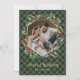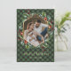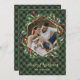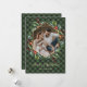 Elégante photo couleur vert et or personnalisée carte de Noël avec titre calligraphique et avec cadre photo géométrique orné d'une couronne botanique. Personnalisez facilement ces cartes de Noël avec votre image et votre nom de famille.