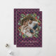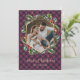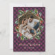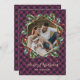 Elégante carte de Noël couleur or et violet avec titre de calligraphie et cadre de photo géométrique orné d'une couronne botanique. Personnalisez facilement ces cartes de Noël avec votre image et votre nom de famille.