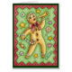 Illustration vintage de Noël avec un bonhomme en pain d'épice soufflant dans une corne, tenant un bâton de bonbon et entouré de friandises.