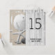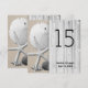 Cartes de numéro de table de mariage de plage carrées recto-verso. Les numéros, les noms et la date du mariage sont imprimés sur les deux côtés en noir, sur une image de bois gris (promenade) avec une étoile de mer, un dollar de sable et des coquillages dans le sable.