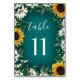 Cartes de numéros de table de mariage au tournesol sarcelle - comportent un fond en bois de grange sarcelle ou turquoise orné de marguerites aquarelles, tournesols, verdure, gypsophile et muguet.