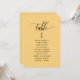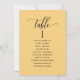 Aidez vos invités à trouver leur table avec cette élégante carte moderne et jaune avec des noms d'invités. Cartes recto-verso pour que les clients puissent chercher leur nom à l'avant ou à l'arrière. Libérez de l'espace tout autour en vous donnant la liberté d'utiliser des clips ou un trou de perforation pour accrocher des écrans, ou d'utiliser le support/cadre de table. Arrière - plan jaune et texte noir. Détails de calligraphie manuscrite moderne. Plusieurs options de couleur. Ayez tous les numéros de table dans la même couleur ou mélangez les couleurs selon le thème de couleur de votre événement. Une partie de notre collection "Elegant Yellow Event Signs and Products" avec une variété de produits de coordination disponibles, y compris les cartes de numéro de table et les menus.