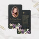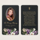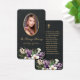 Elégante photo florale noir et or, funérailles/mémorial/cartes de prière avec un arrangement floral avec fleurs violettes, orchidées blanches et verdure.