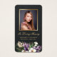 Elégante photo florale noir et or, funérailles/mémorial/cartes de prière avec cadre photo doré et arrangement floral violet et blanc avec orchidées et verdure.