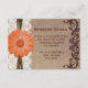 Cette carte de réception de mariage rustique de campagne de couleur pêche ou corail peut être utilisée pour donner les directions à la réception ou pour des cartes d'hébergement à l'hôtel ou tout autre élément nécessaire pour votre mariage. Cette carte de réception est parfaite pour tout mariage rustique à la campagne. Elle présente un fond de papier vintage rustique avec une impression de défilement floral orné et une dentelle imprimée et un ruban de ficelle sur le côté avec une jolie fleur de marguerite pêche ou orange clair. Parfait pour tout mariage à la campagne ou dans une grange. Ajoutez simplement les détails de votre réception à la carte. La ficelle et la dentelle sont juste des motifs imprimés. Ce n'est pas de la véritable dentelle ou ficelle.