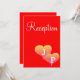 Conception d'amour de mariage unique et accrocheuse. Cartes de réception de mariage romantiques avec deux cœurs sur le devant dans des nuances de coucher de soleil en jaune doré, rose sur fond rouge avec texte blanc. Personnalisez le dos des cartes de réception avec vos détails de mariage (tapez à la place de mon exemple de texte). Insérez l'initiale monogrammée du nom de famille du couple marié en texte argenté. Conception originale de TamiraZDesigns