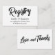 Ces inserts élégants de cartes de détail ont été conçus pour correspondre à d'autres éléments dans une suite de mariage et d'événements en croissance qui présente un design simple noir sur blanc. Sur le devant, vous lisez "Registry" dans un script audacieux et moderne, une police manuscrite ; sur le dos, j'ai placé un graphique magnifiquement rendu des mots "Love and Thanks" (Amour et Merci). Tout type modifiable est rendu dans une police serif polyvalente. Il suffit d'utiliser les champs modèles et de remplacer mon texte de remplissage par vos propres détails personnels pour faire de ces cartes votre propre. L'arrière - plan peut être changé en n'importe quelle couleur de votre palette mariage que vous préférez. N'hésitez pas à me contacter si vous avez des demandes spéciales ou avez besoin d'autres articles. Je suis également heureux de vous aider à personnaliser ces cartes si vous en avez besoin. // 89 // Conçu par Melody Watson pour Paper Muserie