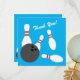 Ajoutez votre propre texte personnalisé pour garçon ou fille. Fond bleu ou couleur personnalisée. Design avec quilles et boule de bowling.