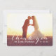 Simple Script manuscrit superposition Mariage photo Merci Cartes. Design par Elke Clarke© pour MonogramGallery imprimé par Zazzle. Envoyez votre message de remerciement mariage en tant que nouveaux mariés à vos amis et votre famille en utilisant ce carte photo de remerciement simple et magnifique avec les mots "merci" écrit dans une main blanche écrire typographie script texte superposition. Remplacez l'exemple de photo par le vôtre. Ajoutez votre message de remerciement personnel au dos. Autres couleurs disponibles.
