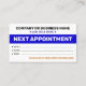 Restez en avance sur la concurrence avec nos cartes de rappel de prochain rendez-vous en gros ! Ces rappels professionnels s'assurent que les clients ne manquent jamais leurs rendez-vous de suivi, améliorant la fidélité et maximisant votre emploi du temps. Le design épuré et moderne projette une image soignée, tandis que le paquet en gros offre une valeur exceptionnelle. Parfaites pour tout service professionnel, des cabinets médicaux aux salons, ces cartes fournissent un système de planification tangible et fiable. Augmentez l'efficacité et la fidélité de vos clients avec nos cartes de rappel de prochain rendez-vous de haute qualité en gros. Commandez les vôtres dès aujourd'hui et constatez la différence !