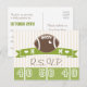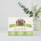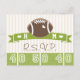 AJOUTEZ LES INITIALES DE LA MARIÉE ET DU MARIÉ À CES CARTES POSTALES DE RÉPONSE ET RSVP POUR UNE FÊTE DE MARIAGE, UNE FÊTE DE COUPLE OU UNE FÊTE DE MARIÉE, UNE FÊTE D'ANNIVERSAIRE OU UN DINER DE FIANÇAILLES SUR LE THÈME DU FOOTBALL. UN FOOTBALL AVEC UN CŒUR DESSUS SUR UN FOND À RAYURES CRÈME ET BLANC. AJOUTEZ LE MONOGRAMME DE LA MARIÉE ET DU MARIÉ SUR LA BANNÈRE À MOTIF DE RUBAN VERT IMPRIMÉ ENCADRÉE DE CŒURS BLANCS AU-DESSUS D'UN TERRAIN DE FOOTBALL 50 YARD. RSVP EN MARRON FOOTBALL. ŒUV