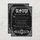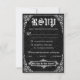 Voici des cartes de réponse RSVP de mariage inspirées du style gothique victorien en noir avec des ornements, des volutes, un travail de volute, une bannière, un cadre de volute florale, un fond à motif damassé et d'autres détails de style ancien inspirés de la période médiévale gothique et de l'ère victorienne. Élégance et raffinement à leur meilleur. Vous pouvez personnaliser les champs de texte d'exemple à votre goût.