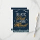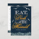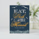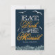 Cartes de réponse de mariage nautique bleu marine et orange -- correspondent aux invitations et plus encore trouvées ci-dessous sur cette page. Complétez votre thème de mariage nautique avec ces invitations qui présentent des oiseaux, des vagues océaniques en bas et la nouvelle phrase populaire, "Mangez, buvez et soyez mariés". Ce design présente un fond bleu marine avec quatre oiseaux blancs. La lettre fantaisiste est une combinaison de couleurs orange et blanc. Les vagues du bas sont ombrées dans une couleur bleu très clair. Le dos présente le même fond bleu foncé avec un cadre de vague ornemental blanc assorti pour plus d'élégance. Vous pouvez mettre à niveau le type de papier cartonné pour des options plus chics que celles ci-dessus à droite. Chaque carte de réponse est livrée avec une enveloppe blanche ajustée. Voir l'invitation de mariage correspondante ci-dessous pour les détails de conception.