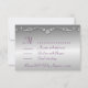 Les cartes de réponse de mariage Purple peacock sont imprimées avec de belles plumes de paon dans diverses nuances - violettes, aqua, vert et une touche d'or. Le bas de chaque carte de réponse comporte un sceau de monogramme qui dit "RSVP" en écriture cursive élégante entourée de petits diamants d'accent imprimés sur fond argenté. Le dos et le devant présentent également des bijoux fantaisie argentés avec des diamants et des accents de puces. Le dos présente un diamant solitaire centré à l'intérieur des bijoux. Cliquez sur le bouton orange "personnaliser" ci-dessous pour modifier le style de police, la couleur, les tailles et bien plus encore, ou utilisez simplement la fonction de personnalisation pour modifier la date de réponse au dos en fonction de vos besoins. Si vous aimez ce design, vous pouvez trouver des invitations de mariage assorties, des sceaux d'enveloppe et bien plus encore dans ce thème de paon ci-dessous.